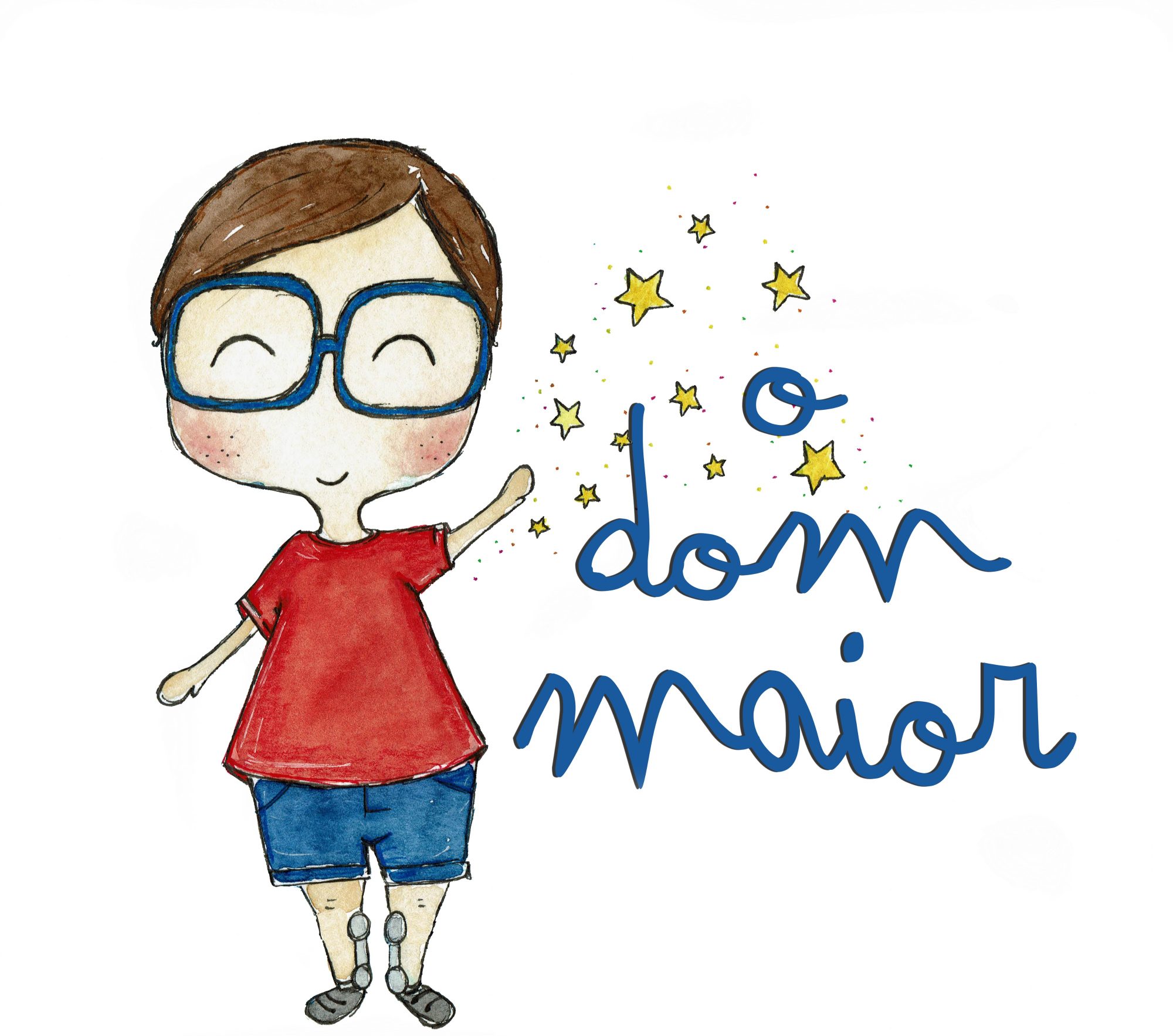 JunImagem de uma ilustração representando um menino com cabelos castanhos, óculos de massa, com uma t-shirt vermelha e calções azuis. à sua esquerda um conjunto de estrelas amarelas para onde dirige a mão. e a menção