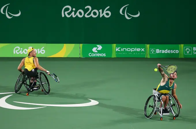 O ténis em cadeira de rodas foi disputado pela primeira vez nos Jogos de Barcelona, em 1992. O jogo segue as regras para pessoas não deficientes, com uma exceção – a bola pode ressaltar duas vezes. A modalidade está aberta a atletas com perda de função permanente ou substancial de uma ou de ambas as pernas.