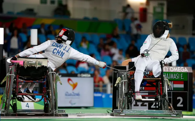 A esgrima em cadeira de rodas teve a sua estreia nos Jogos Paralímpicos de Roma 1960. São elegíveis para competir atletas amputados, com lesões na medula espinhal ou paralisia cerebral. As cadeiras de rodas são presas ao solo durante as provas.
