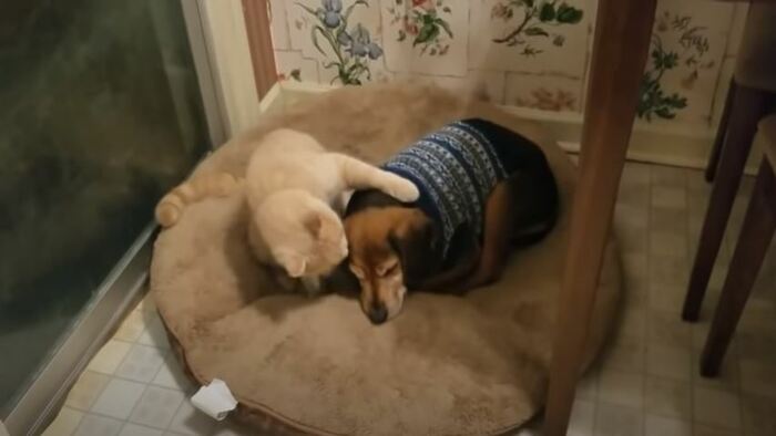 Em um vídeo registrado e postado nas redes sociais pela tutora dos animais, é possível ver Jim fazendo carinho e dando abraços em Bruce, enquanto este se acomoda para dormir. Assista à cena: