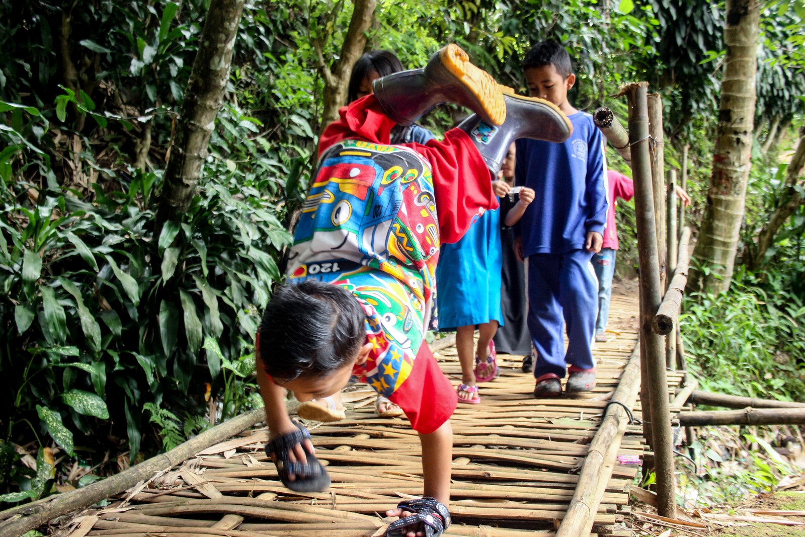 Apesar da deficiência, ele consegue atravessar os mesmos caminhos pedregosos e passar pela mesma ponte de madeira que as outras crianças para chegar ao colégio, no oeste da ilha de Java, acompanhado por sua mãe.