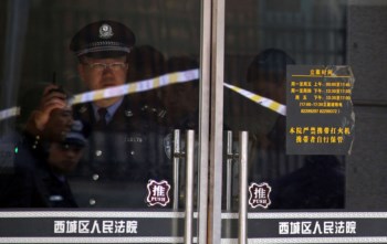 Polícia barra a passagem no tribunal onde hoje foi pronunciada a sentença contra Ni Yulan e o marido (David Gray/Reuters)