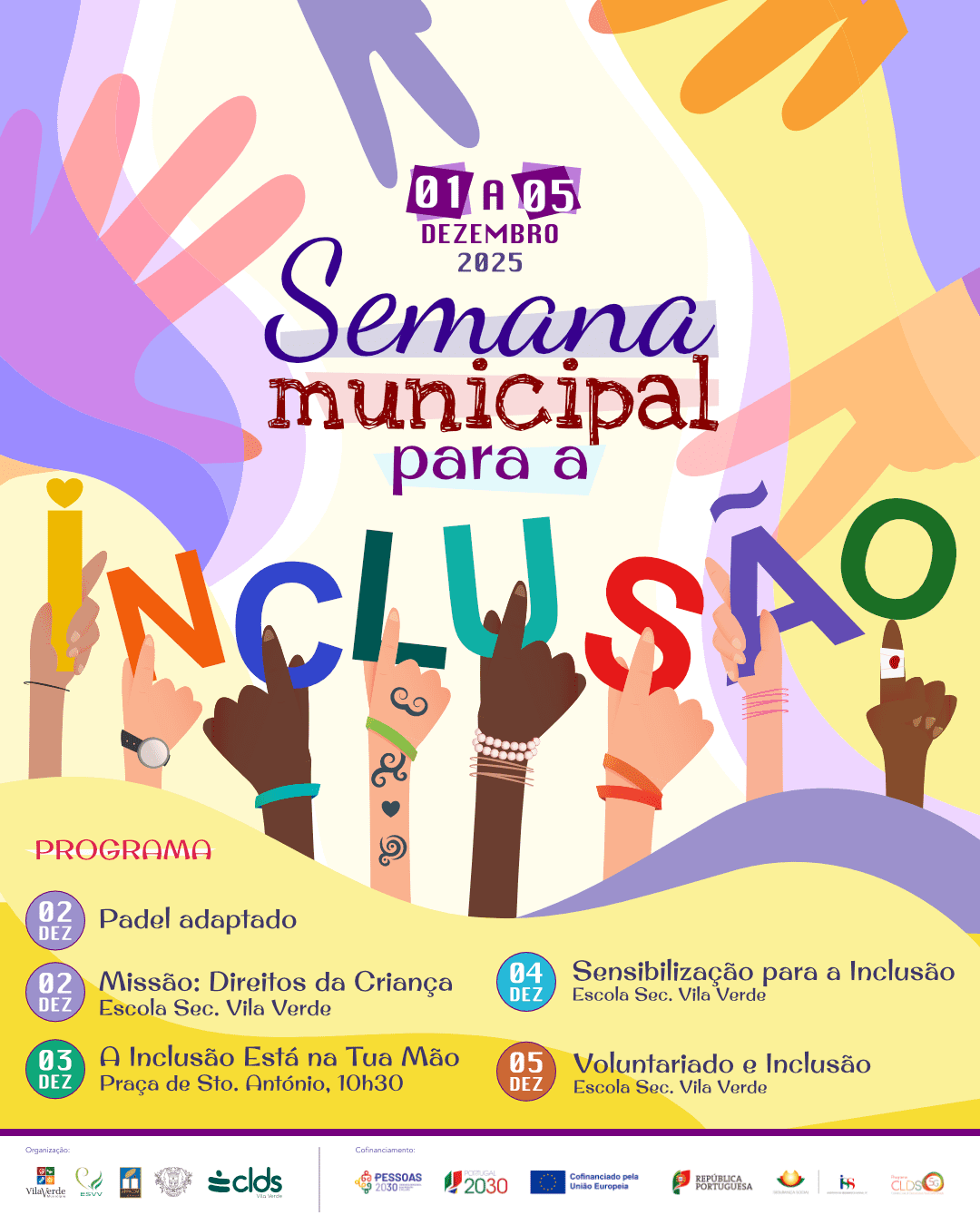O programa arranca a 2 de dezembro com uma sessão de padel adaptado destinada a crianças e jovens com deficiência. No dia seguinte, realiza-se a atividade “Missão Direitos da Criança” na Escola Secundária de Vila Verde, seguida do “momento central” na Praça de S. António, onde diversas instituições apresentarão moldes de mãos pintados, simbolizando a diversidade e a união da comunidade. Segue-se a exibição do filme Amigos Improváveis e debate sobre inclusão a 4 de dezembro e, no último dia, 5 de dezembro, uma palestra sobre voluntariado e intervenção social.